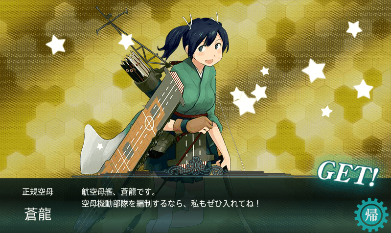 ちなみにおかゆは新米提督レシピで回したところ蒼龍が出ました。